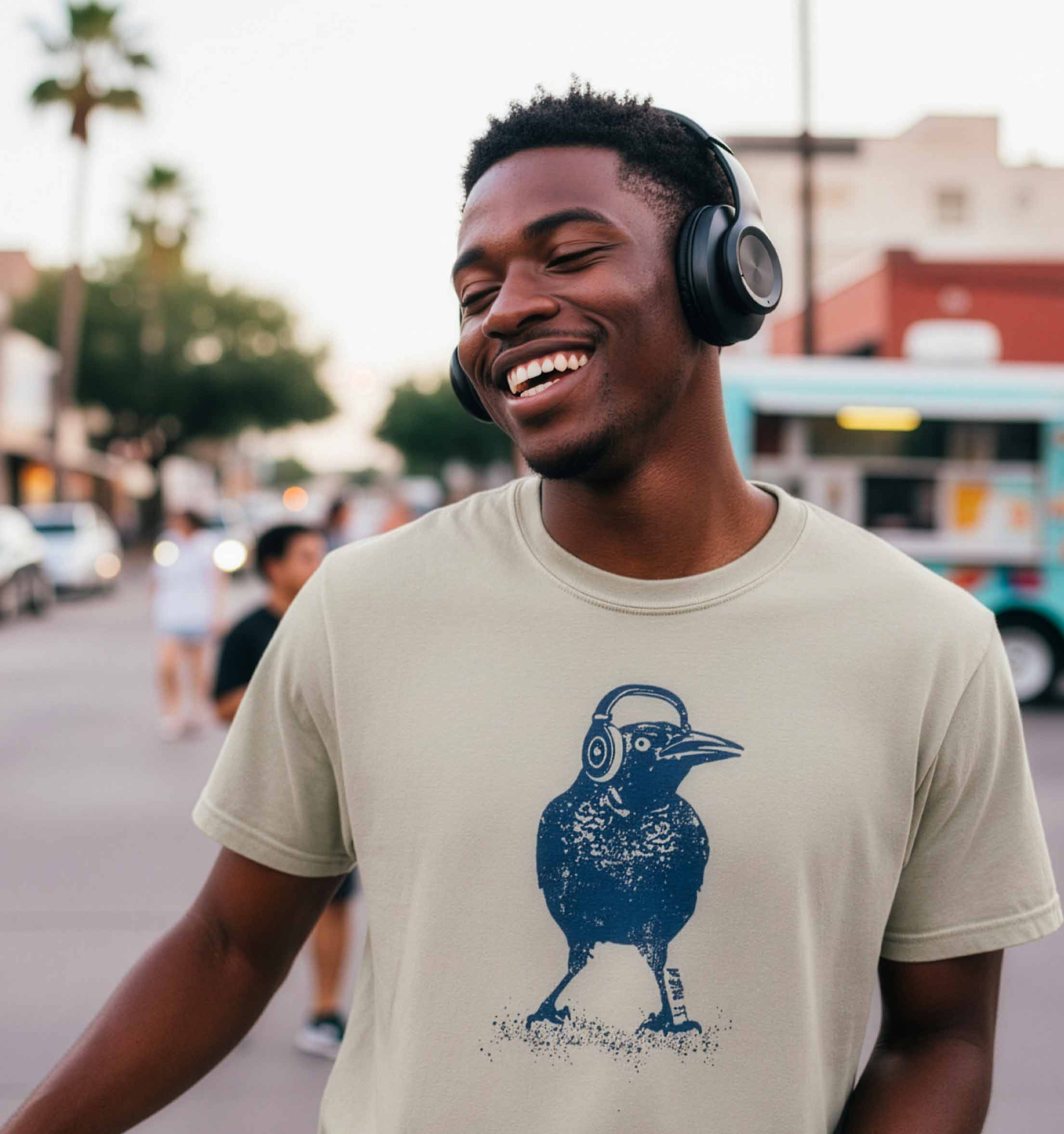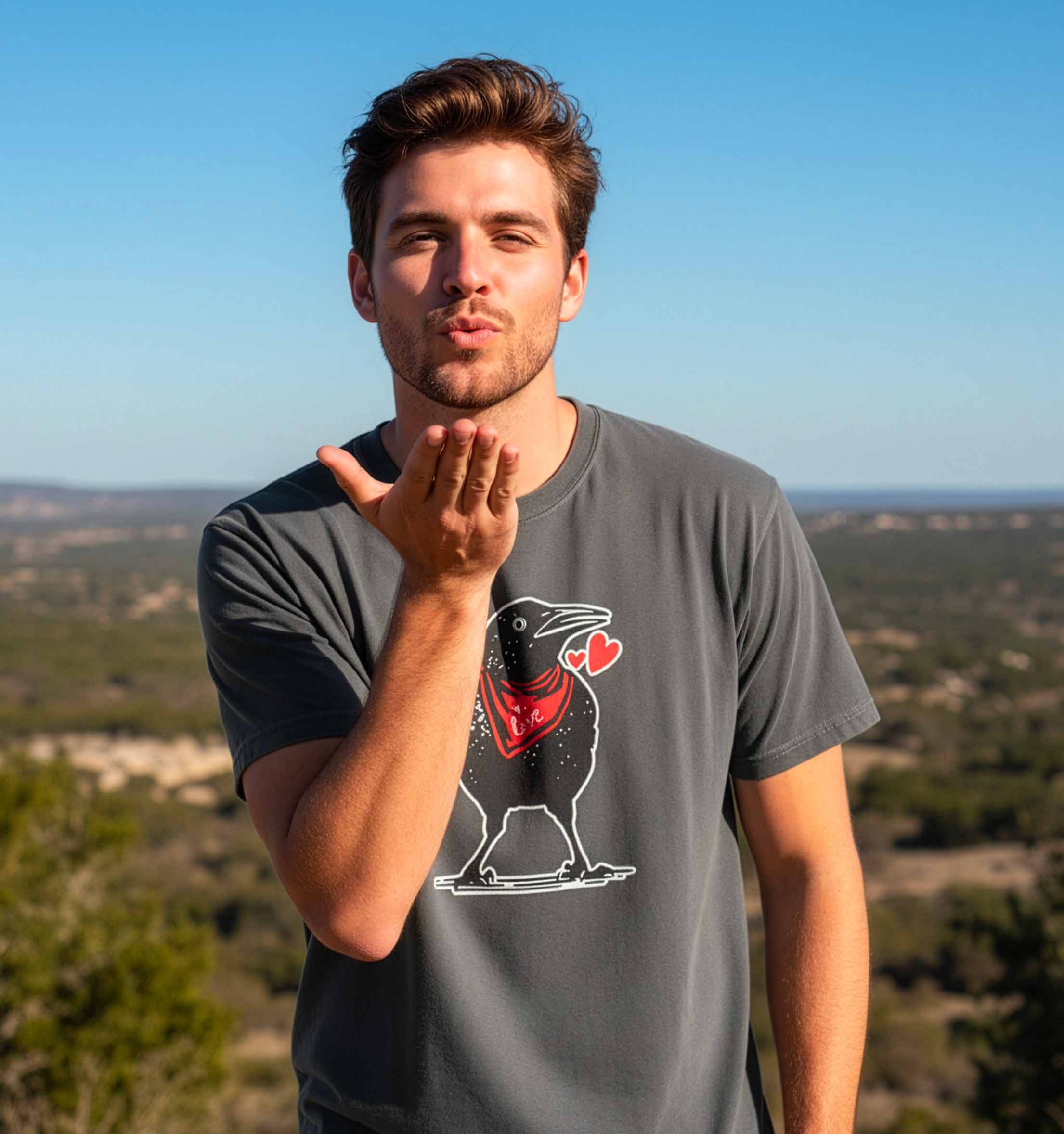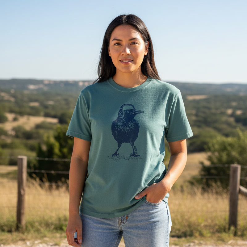 Austin’s unofficial DJ, bringing bold grackle energy to a soft, garment-dyed tee.