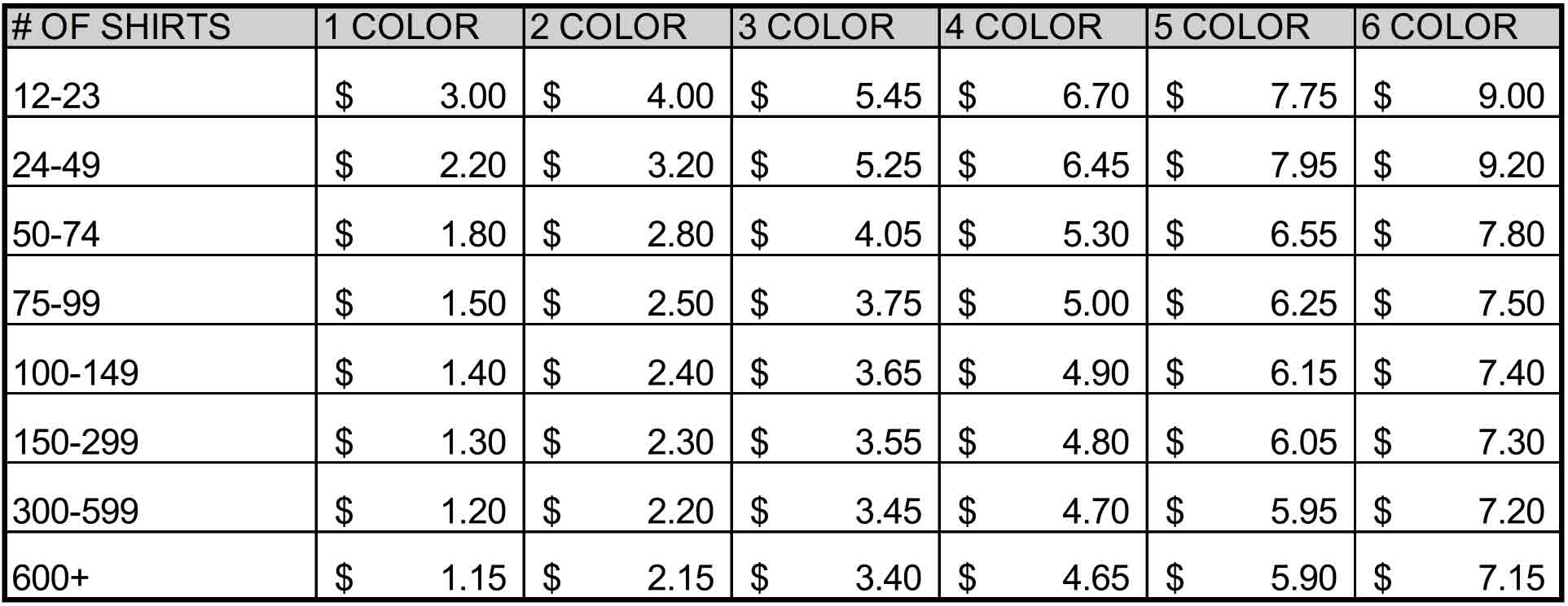 - Screen Printing uses 1 screen for each color. Screen Print set up fee is $20 each screen.
