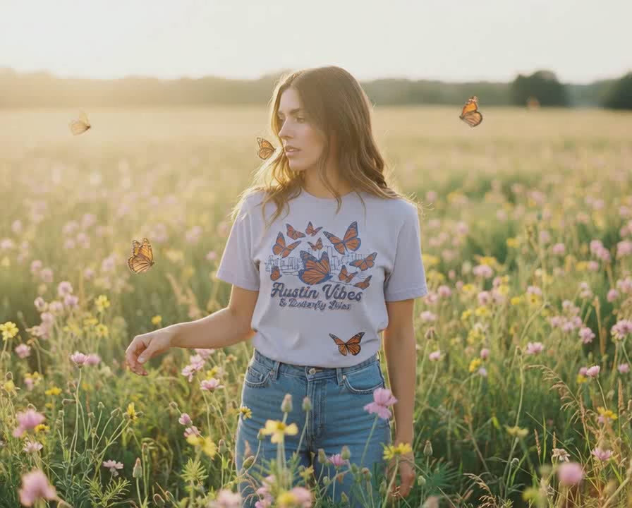 Our Austin Butterfly Skies tee features a vibrant monarch butterflies drifting above the Austin skyline — a symbol of transformation, freedom, and those unforgettable Texas skies at golden hour. It’s a wearable reminder to slow down, look up, and enjoy where the moment takes you.